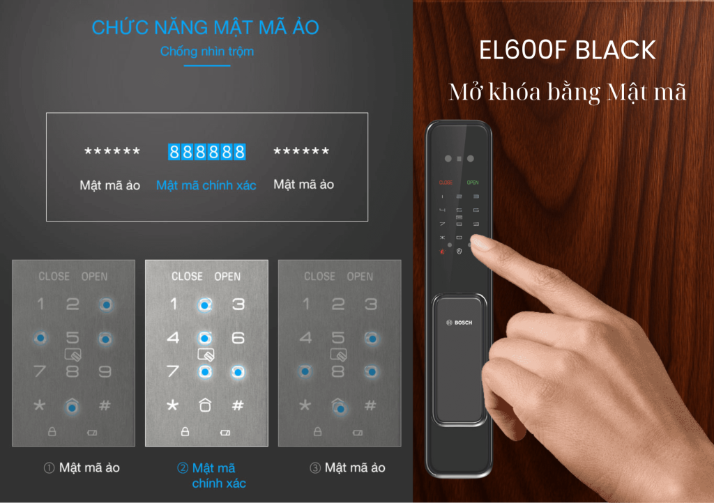 Hệ thống mã số được bảo vệ bằng công nghệ xáo trộn ký tự ngẫu nhiên và mật khẩu ảo lên tới 32 ký tự, khiến kẻ gian không thể đoán mã ngay cả khi họ quan sát bạn nhập. Cơ chế này đặc biệt phù hợp với môi trường đông người như chung cư, văn phòng.