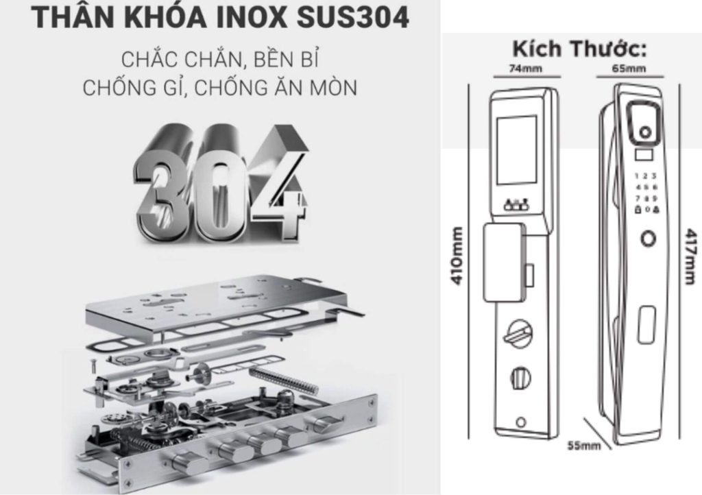Kích thước khóa: 410 x 74mm (thân ngoài), 417 x 55mm (thân trong)