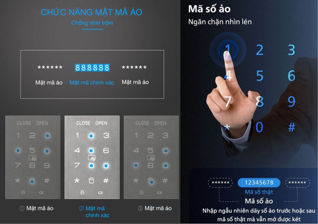 Hỗ trợ nhập mật khẩu lên đến 32 ký tự, đồng thời có khả năng xáo trộn mã số trước và sau mã thật. Điều này giúp người dùng tránh bị nhìn trộm mật khẩu khi nhập mã mở cửa, tăng cường độ bảo mật tối ưu.