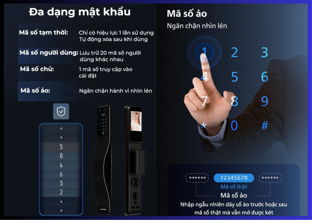 MÃ SỐ ẢO: Cho phép nhập mã số giả kèm theo mã thật để đánh lừa người nhìn trộm, tăng độ bảo mật.
