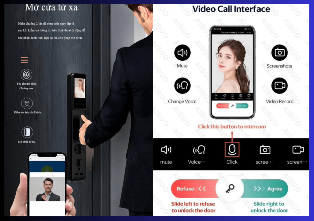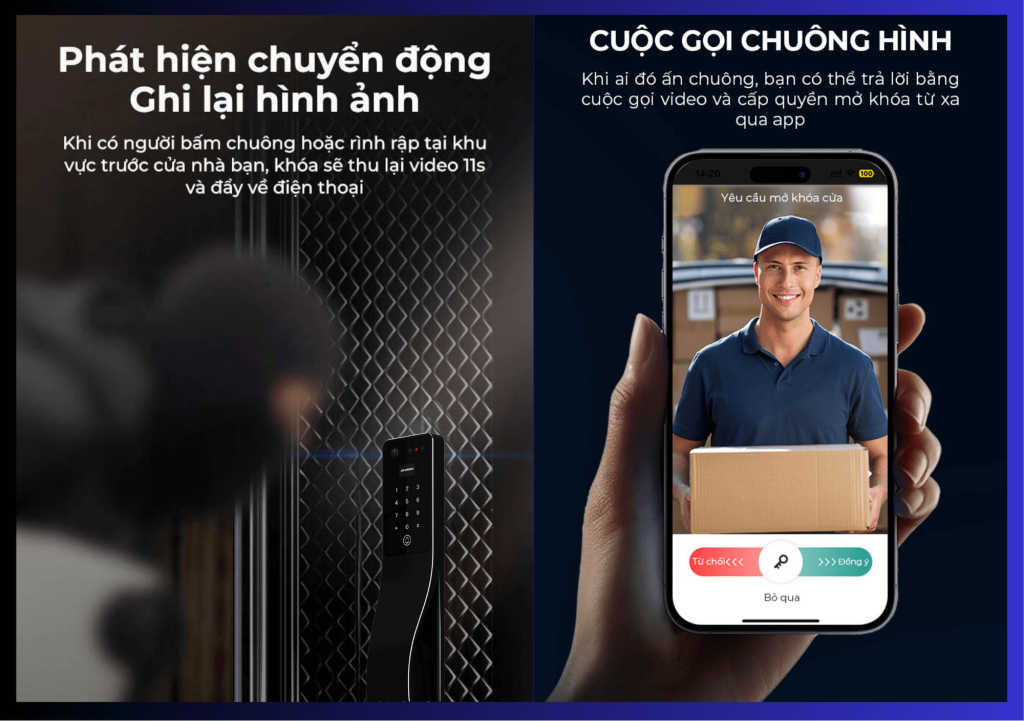VIDEO CALL: Tính năng gọi điện trực tiếp giữa người đứng ngoài cửa và chủ nhà qua điện thoại, nâng cao trải nghiệm và tính chủ động trong kiểm soát ra vào.