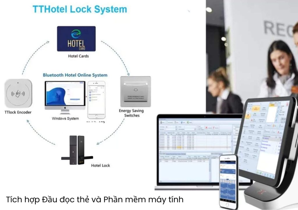 Tích hợp đầu đọc thẻ và phần mềm quản lý: Giúp ban quản lý khách sạn theo dõi lịch sử ra vào từng phòng, phân quyền truy cập linh hoạt, bảo mật cao.