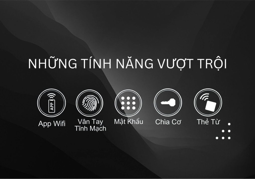 Tích hợp ứng dụng điều khiển qua WiFi, người dùng có thể mở khóa từ xa, quản lý danh sách người dùng, theo dõi lịch sử ra vào, gửi mã số tạm thời hoặc thẻ ảo cho khách. Giao diện App hiện đại, dễ thao tác, bảo mật hai lớp an toàn cao.