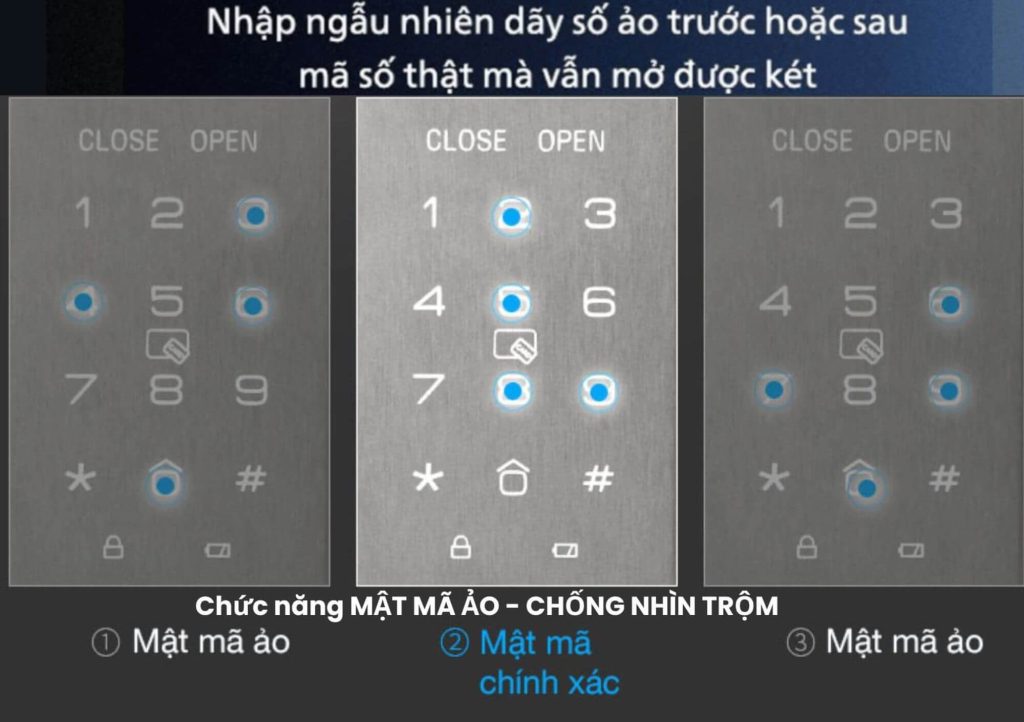 Tính năng mật khẩu ảo lên tới 32 ký tự, cho phép người dùng nhập mã số an toàn mà không lo bị nhìn trộm. Bàn phím cảm ứng siêu nhạy, dễ thao tác ngay cả trong điều kiện thiếu sáng hoặc thời tiết ẩm ướt.